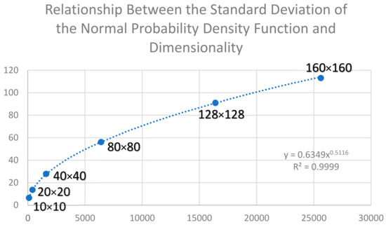 Plot of the relationship between the standard deviation of the normal probability density function of permuted total edge lengths for landscape lattices with two classes of equal proportionality and having a range of dimensionality (10 × 10, 20 × 20, 40 × 40, 80 × 80, 128 × 128, and 160 × 160 cells). The simulation experiment was performed on landscapes with 128 × 128 dimensionality. The y-axis shows standard deviation of the normal probability density function, and the x-axis shows the number of cells in the landscape (nrows*ncols).