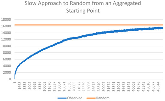 The third criteria for evaluating the thermodynamic consistency of the Cushman [1,2] method is that when a lattice is completely mixed (fully randomized), it should have a value near the maximum theoretical value of the entropy distribution and should fluctuate indefinitely around this maximum theoretical value with further random mixing. We observed this to be the case in the scenario of the dispersed starting condition but not the aggregated starting condition. This is because of the very large difference in the time needed to achieve full mixing in the two scenarios (Figure 5 and Figure 6). Specifically, in the aggregated starting condition scenario, the mixing experiment resulted in a slow, continuous approach to a fully randomized condition but never fully achieved full randomization within the 50,000 time steps (Figure 5). In contrast, the dispersed scenario very rapidly approached randomness within four time steps (Figure 6) and subsequently fluctuated randomly very near the value of maximum theoretical entropy, as required for thermodynamic consistency.