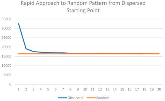 I calculated the curve for the expected distribution of configurational entropy for a lattice of 128 × 128 dimensionality and 50% coverage in each of two classes and plotted the observed configurational entropy of the landscape lattices produced by the two simulation experiments (aggregated and dispersed starting points). The first criteria for thermodynamic consistency of the Cushman [1,2] method of computing the configurational entropy of a landscape lattice is that the mixing experiment would produce configurational entropy predictions that follow the theoretical distribution. This was the case for both the aggregated and dispersed scenarios (Figure 3 and Figure 4). Specifically, the observed entropies of the lattices produced by the mixing experiment perfectly followed the expected theoretical distribution (parabolic function of total edge length).