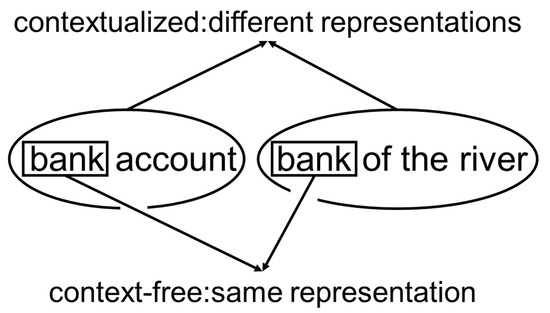 The basis for each neural language model is vocabulary. A vocabulary is a table that assigns each token or word a representation. This representation could be a number or a multi-dimensional vector. These representations are usually called word embeddings. There are a few different implementations of word embeddings. They can be categorized into context-free and contextualized word embeddings. Context-free representations such as Glove [14] and Word2Vec [15] are based only on the characters the word consists of. Contextualized representations are based on the character span of the word and enhancing the representation by the words surrounding the word. Figure 3 illustrates an example that shows the different representations of the word “bank”. In the left sentence, it means a credit institution, and in the right sentence, a geographical phenomenon, although it has the same span of characters.