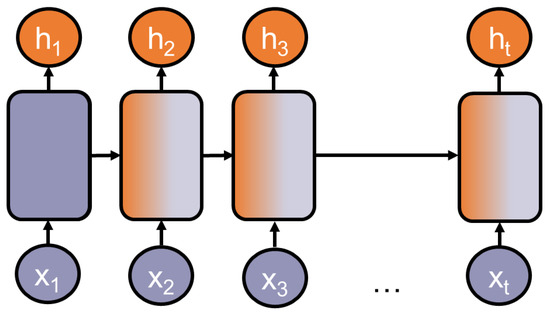 Sequence-to-sequence models are specialized in processing a sequential input, e.g., a list of numbers or a consequential sentence, and producing a sequential output. Probably the most used architecture families are recurrent neural networks or RNNs, introduced by [16]. They are well applicable to language tasks because many tasks rely on sequential data such as continuous texts. A key strength of most RNNs is that they can process and generalize across sequences of values of variable lengths. This strength relies on the model’s ability to share parameters across different parts of a model. Thereby, RNNs can connect information that is distributed across the sequence: for example, where the model’s task is to extract temporal information from a sequence. It has the following two sentences as input: “Today I am feeling sick” and “I am feeling sick today”. In both cases, it should extract “today” independently from its position in the sequence. Ref. [17], p. 373, describes RNNs as a chain of multiple copies of the same network, each one sharing the parameters with its succeeding copy. Figure 4 depicts a chained neural network.