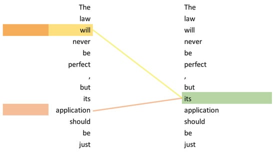 Currently, probably the most used application of the attention mechanism is the transformer architecture, which was introduced by [7]. It uses self-attention, which is an extension of the attention mechanism. The main advantage of self-attention is its auto-regressive property. This means that the model is able to look back to previously processed inputs while encoding the current one. The example in Figure 8 illustrates self-attention. The word “it’s” is correctly associated with the “law”, allowing the model to possibly understand that “it” is semantically equivalent to “the law”. Ref. [23] describes the process of self-attention by dividing it into six steps. In step one, each encoder input word (represented by a vector) is multiplied by three weight matrices, resulting in three different vectors: a query vector, a key vector, and a value vector for each word. These weight matrices are trained in the training process. In step two, the self-attention is calculated for each word. This is done by individually calculating the dot-product of the word’s query vector and the key vector of each word () in the sentence, resulting in n scores. In steps three and four, the scores are divided by the square root (e.g., 8 in [7]) of the number of dimensions (e.g., 64 in [7]). Afterward, these scores are all normalized using Softmax. These scores indicate how much each word is expressed at the current position. In step five, each value vector is multiplied by the Softmax score. In the final step, the weighted value vectors are added together and form the output of the self-attention layer of this position.