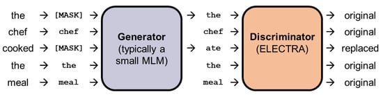 BERT and DeBERTa [8] both use MLM. Ref. [12] proposed a new approach to further exploit the benefits of MLM. Their ELECTRA model consists of two encoders: the generator and the discriminator. Firstly, some of the input tokens are replaced with the [MASK] token. The generator then learns to predict the original identities of the masked-out tokens and replaces the masked-out tokens with its predictions. Then, the discriminator is trained to identify tokens that have been replaced by the generator’s tokens. Figure 11 depicts the process of masking, replacing, and discriminating tokens. Ref. [12] showed that this approach works well on relatively smaller computing resources and still outperforms previous models such as BERT.