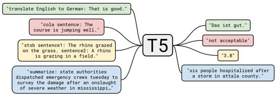 Before applying any input, it has to be brought or unified into the text-to-text structure. One way of unifying the input is to transform every task into one static structure. Ref. [32] did this and formulated everything as a question-answer structure. Ref. [11], p. 11, did it differently: they selected a specific structure for each of their tasks. This allowed them to always train using maximum likelihood. Here are a few examples of how tasks are pre-processed before generating a corresponding output with T5: