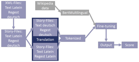 There are several task-specific enhancements or variations of the previously discussed approaches and architectures. One specific example is BertSUM. It was introduced in [33]. It optimizes and modifies the original BERT architecture to achieve better results in extractive text summarization. We applied BertSUM in the field of medieval Latin documents [34]. By using a multi-lingual pre-trained BERT version and a translation service, we were able to generate German summaries of the Latin documents. Figure 13 illustrates the architecture of [34] and shows how summarization and translation can be combined.