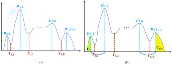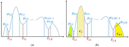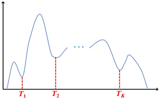 The above process is repeated, and the search for the rth threshold is stopped if the difference between two consecutive thresholds is less than , i.e., . Then the rth optimal threshold is set as . The iteration is stopped when all the optimal thresholds T1, T2, …, TK (as shown in Figure 5) are found.