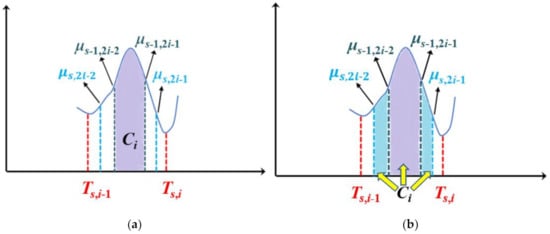 In the s (s ≥ 3) iteration, new thresholds Ts,i (i = 1, …, K) are respectively obtained by applying the Otsu method to intervals [μs−1,1, μs−1,2], [ μs−1,3, μs−1,4], …, [μs−1,2K−1, μs−1,2K] which are produced from the previous iteration. Two class means μs,2i−1, μs,2i are obtained by Ts,i in the interval [μs−1,2i−1, μs−1,2i] (i = 1, …, K). New pixels are added to classes C1, C2, …, CK+1, respectively; C1 and CK+1 are expanded by adding new pixels whose gray values are in the intervals [μs−1,1, μs,1] and [μs,2K, μs−1,2K], respectively. Ci (i = 2, …, K − 1) is expanded by adding new pixels whose gray values are in the intervals [μs,2i−2, μs−1,2i−2] and [μs−1,2i−1, μs,2i−1]. For clarity, an example of the process to update class Ci is displayed in Figure 4. In Figure 4a, μs−1,2i−2 and μs−1,2i−1 are two class means obtained from the (s−1)th iteration, in which iteration class Ci includes pixels whose gray values are in the interval [μs−1,2i−2, μs−1,2i−1] (shown as the purple part). In Figure 4b, μs,2i−2 and μs,2i−1 are two new class means obtained from the sth iteration. Pixels in the two intervals [μs,2i−2, μs−1,2i−2] and [μs−1,2i−1, μs,2i−1] (two blue areas) are divided into class Ci.