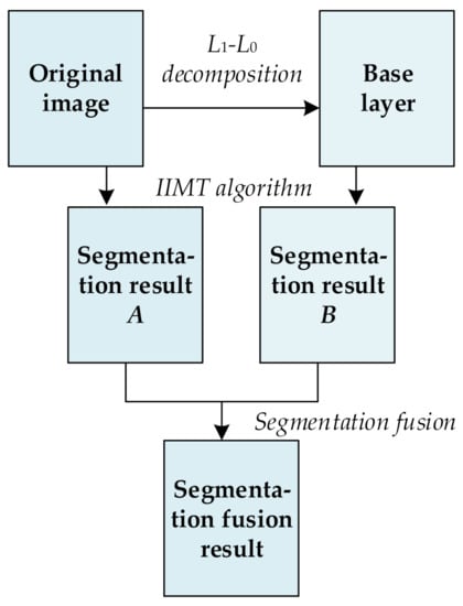 - The original image and its base layer are segmented by the IIMT algorithm, and their segmentation results are denoted A and B, respectively.