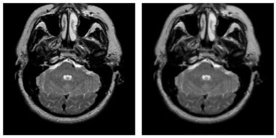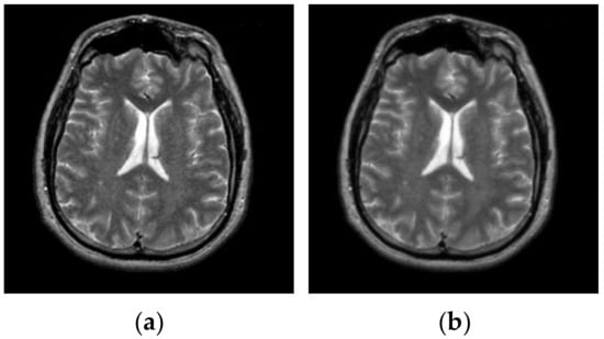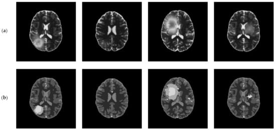 In this subsection, we applied the proposed algorithm to the BRATS (Multimodal Brain Tumor Image Segmentation Benchmark) database. The BRATS database (http://www.imm.dtu.dk/projects/BRATS2012/data.html, accessed on 25 September 2021) is compiled from the international brain tumor segmentation challenge in MICCAI 2012 conference. It is a widely used database and composed of multi-contrast brain MR scans of 25 low-grade and 25 high-grade glioma cases and the corresponding ground truth. Each case includes four modalities—T1, T1c, T2, and FLAIR [44]—and each MR scanning sequence contains more than one hundred images. Figure 20 presents an example of brain MR images from BRATS. Figure 20a shows the original images and the corresponding ground truth is displayed in Figure 20b.