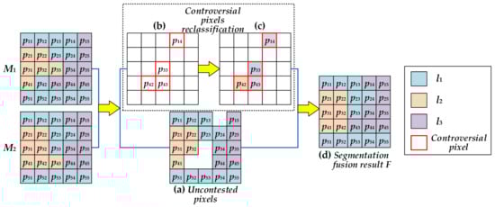 Figure 8 shows a simple example of segmentation fusion. In Figure 8, it can be observed that all the pixels are partitioned into three classes l1, l2, l3. The uncontested pixels are shown in Figure 8a. Pixels p11, p12, p13, p23, p24, p51, p52, p53, p54, p55 belong to class l1. Pixels p21, p22, p31, p32, p41 belong to class l2. Pixels p15, p25, p34, p35, p44, p45 belong to class l3. The remaining pixels p14, p33, p42, p43 are controversial pixels, as shown in Figure 8b. The class labels of each controversial pixel in M1 and M2 are inconsistent. Taking pixel p14 as an example, p14′s class label in map M1 is . However, it is classified into class l3 in map M2, i.e., . The four controversial pixels need to be reclassified by Equation (9). In Figure 8c, it can be seen that their final class labels are l(p14) = l3, l(p33) = l2, l(p42) = l1, l(p43) = l3. Finally, the segmentation fusion result F (Figure 8d) can be obtained by combining the uncontested pixels (Figure 8a) and the reclassified pixels (Figure 8c).