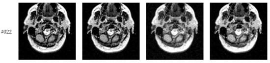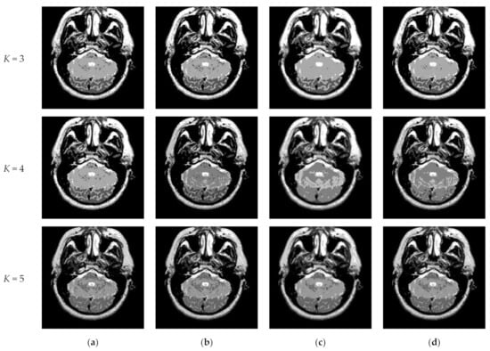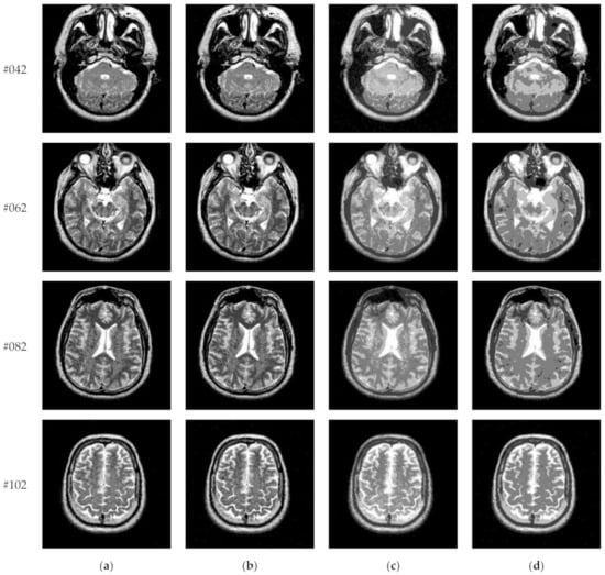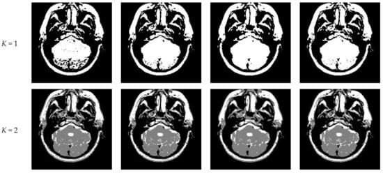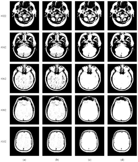Transaxial MR-T2 brain images with various slices downloaded from “The Whole Brain Atlas” of Harvard Medical School (http://www.med.harvard.edu/aanlib/home.html, accessed on 17 May 2021) were used in the segmentation experiments. Because space is limited, the ten brain slices #022~#112 displayed in Figure 9 were chosen to demonstrate the performance of our proposed algorithm. Parameters for the proposed algorithm are listed in Table 1. All experiments were performed on a computer with Intel(R) Core(TM) i7-7500U CPU, 2.70 GHz, 8GB RAM, Windows 10 using MATLAB 8.1.0.604 (R2013a).
