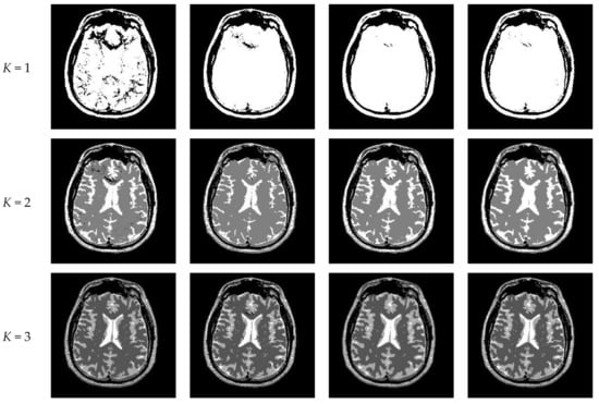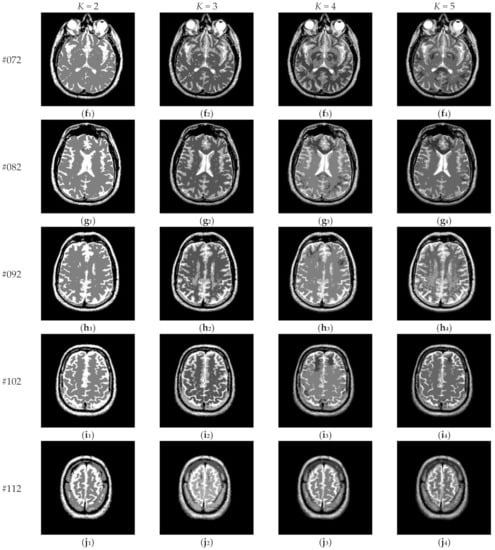 Figure 17 depicts the segmentation results of Proposed for brain slices #022~#112 with the number of thresholds K from 2 to 5. It can be seen that segmentation results with different threshold numbers have different effects. In general, the higher the level of thresholding, the better segmentation quality. Table 4 displays the comparison of optimal threshold values obtained by different algorithms with K = 2, 3, 4, 5. The proposed algorithm and LLF-DCE are based on the fusion scheme. The former combines two different segmentation results obtained by IIMT and HL-IIMT; the latter combines two different segmentation results obtained by LLF-Otsu and DCE-Otsu. In Table 4, it can be seen that the final thresholds selected by different algorithms are different from each other.