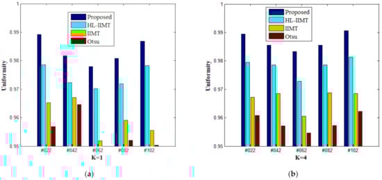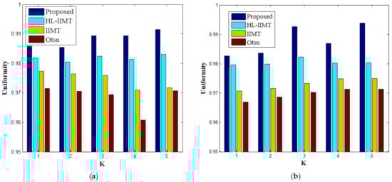 where K denotes the number of thresholds; Ii represents the gray value of pixel i in original image I; Sj refers to the jth segmented class of image I; denotes the average gray value of all pixels in Sj; M × N represents the size of image I; Imax and Imin denote the maximum gray value and the minimum gray value of pixels in image I, respectively. The values of uniformity measure U are between 0 and 1. The higher the value, the better the performance, and vice versa.