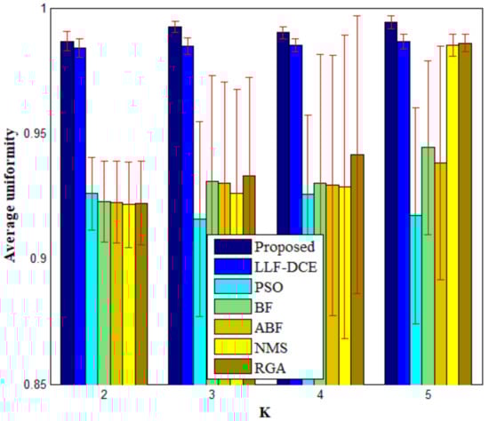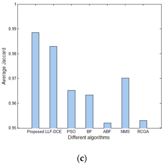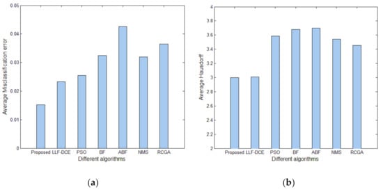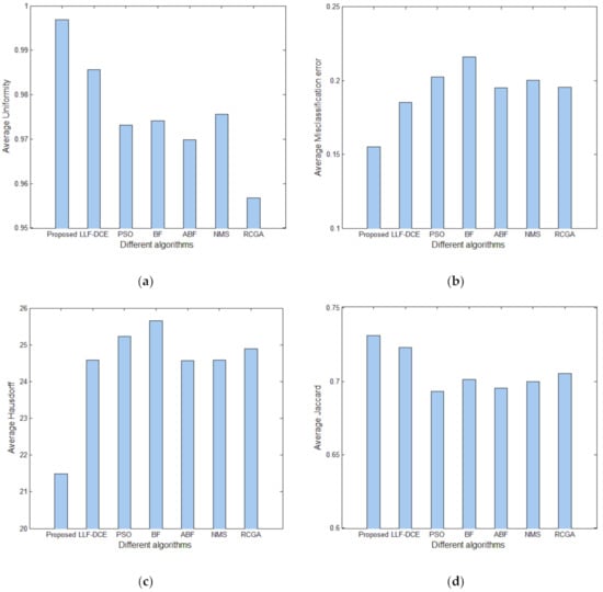 In order to show the comprehensive performance of the proposed algorithm, Figure 18 shows average values and standard deviations of U for different segmentation algorithms with the number of thresholds K from 2 to 5. It can be noted that the average U values of the proposed algorithm are higher than those of other comparison algorithms for each level of thresholding, which indicates superior segmentation quality. In particular, they are significantly higher than the average U values of PSO, BF, ABF, NMS, and RGA in the cases of K = 2, 3, 4. The error bars (standard deviations) of Proposed and LLF-DCE are obviously shorter than those of other segmentation algorithms. Figure 19 shows the comparison of average values of the misclassification error, Hausdorff distance, and Jaccard index for different algorithms. It can be noted that the proposed algorithm achieves the lowest misclassification error and Hausdorff distance, and the highest Jaccard index. In addition, LLF-DCE also performs well when compared with others.