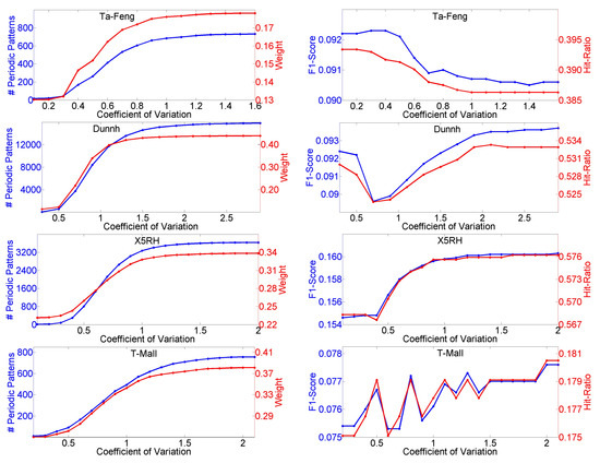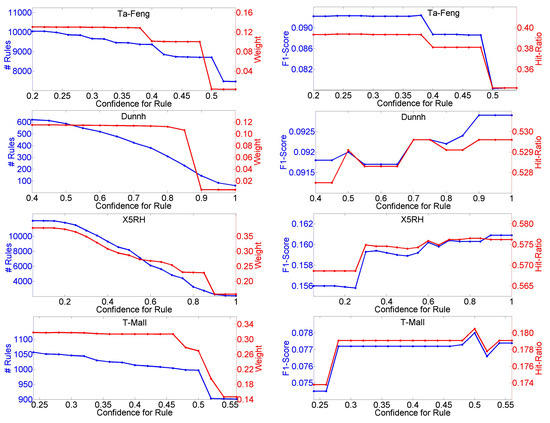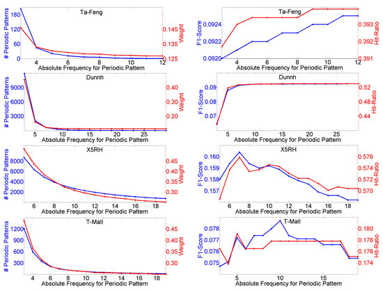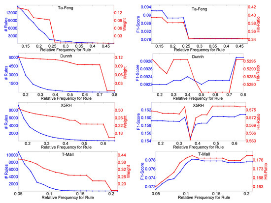 Our algorithm is composed of two prediction strategies. We obtain the best performance only on the right proportion of weight on pattern prediction and preference prediction. There are four parameters in pattern prediction: relative frequency threshold and confidence threshold for sequential rule mining and association rule mining, threshold for coefficient of variation and absolute frequency threshold for periodic pattern mining. All of these parameters have an influence on the weight of these two prediction strategies. In this subsection, we will evaluate the influences of these parameters. k is set to the average basket size of each dataset. The values for the remainder of the parameters are preset to be , , and for Ta-Feng, , , and for Dunnh, , , and for X5RH, and , , and for T-Mall.