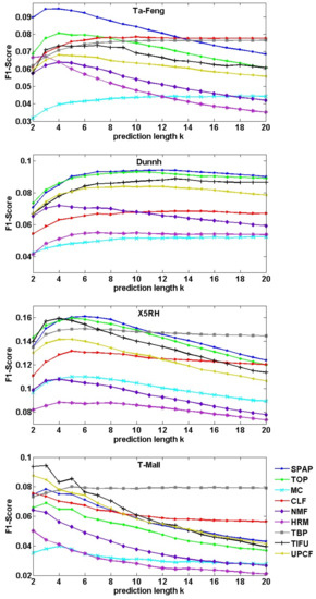 We noticed that all algorithms, except , exhibit poor performance for - when k is too higher or lower than the average basket size. The most obvious finding is on T-Mall dataset, which has the smallest average basket size. Because - is relevant to the size of recommended basket . A higher value for k means we will select more products to recommend, leading to a large size for and a lower value for ; otherwise, we have a lower value for . However, when the value of k increases, it results in a higher possibility of being hit, and - rises naturally. Only k has a value nearer to the average basket size, and we have a fairer comparison.