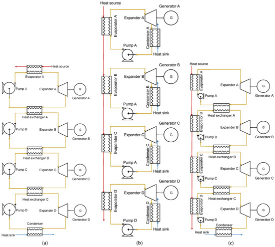 Three varying configurations of the Multi-Loop Organic Rankine Cycle. (a) Series type. (b) Parallel type. (c) Series–parallel type.