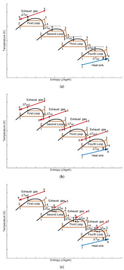 T-s diagrams of three various Multi-Loop Organic Rankine Cycle. (a) Series type. (b) Parallel type. (c) Series–parallel type.