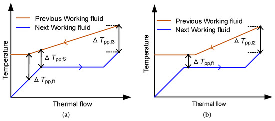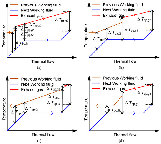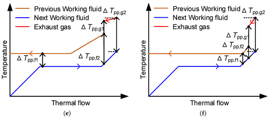 Probable circumstances of PPTD in series–parallel MLORC. (a) The next working fluid is preheated by the previous working fluid and exhaust gas, evaporated and superheated by the exhaust gas. (b) The next working fluid is preheated by the previous working fluid, evaporated by the previous working fluid and exhaust gas, and superheated by the exhaust gas. (c) The next working fluid is preheated and evaporated by the previous working fluid, and superheated by the previous working fluid and exhaust gas. (d) The next working fluid is preheated by the previous working fluid, evaporated by the previous working fluid and exhaust gas, and superheated by the exhaust gas. (e) The next working fluid is preheated and evaporated by the previous working fluid, and superheated by the previous working fluid and exhaust gas. (f) The next working fluid is preheated and evaporated by the previous working fluid, and superheated by the previous working fluid and exhaust gas.