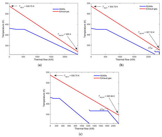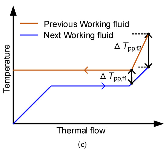 Probable circumstances of PPTD in series MLORC. (a) The pinch points may appear at the super-cooling zone, liquid saturation point, and the outlet of the next working fluid. (b) The pinch points may appear at the two-phase zone, and the outlet of the next working fluid. (c) The pinch points may appear at the super heated zone, and the outlet of the next working fluid.
