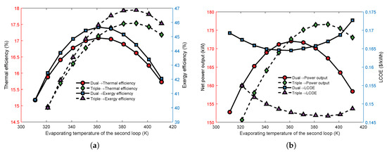 The effect of second loop’s evaporating temperature on the thermoeconomic performance of the series MLORC. (a) Effect on thermal and exergy efficiency. (b) Effect on power output and LCOE.