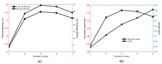 The effect of loop number on the thermoeconomic performance with the series MLORC. (a) The effect on thermal and exergy efficiency. (b) The effect on power output and LCOE.
