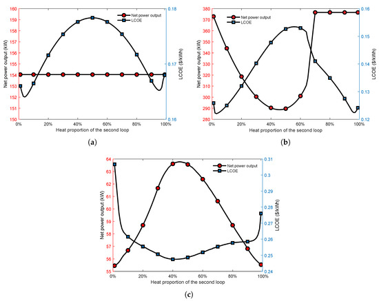 Effect of the distribution of heat energy on the thermoeconomic parallel dual-loop ORC under various outlet temperatures and inlet temperatures of the exhaust gas. (a) Inlet and outlet temperature of the heat source are higher than the working fluid critical temperature. (b) . (c) .