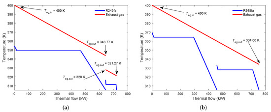 Composite Curves for dual-loop ORC in the scenario . (a) Heat proportion of the second cycle is 90%. (b) Heat proportion of the second cycle is 50%.