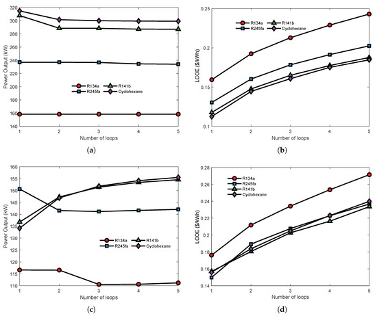 Effect of the second loop’s evaporating temperature on the thermoeconomic performance of the series MLORC. (a) Effect on power output under . (b) Effect on LCOE under . (c) Effect on power output under . (d) Effect on LCOE under .