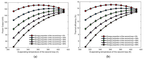Effects of heat proportion and evaporating temperature of the second loop on power output and thermal efficiency with series–parallel configuration. (a) Power output. (b) Thermal efficiency.