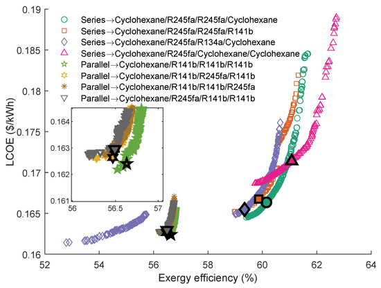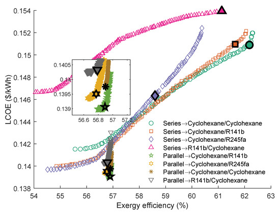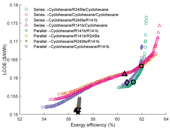 Pareto Frontiers of the series and parallel quadruple-loop ORC with the highest grey relation grade R.