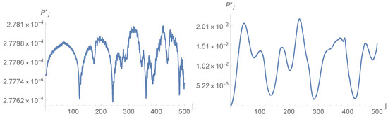 As expected from the behaviour of other QW based search algorithms, at fixed values of the parameters , m, N and , the probability displays strong oscillations in j. For example, Figure 1 displays two typical evolutions of with j, both obtained on a grid of points, with and with located at the center of the central grid cell but for different values of a. Changing does not change too much, at least if one does not proceed too close to the border of the grid (data not shown). However, changing m typically increases the oscillation frequency of , as exemplified Figure 2, which plots against time j for , , and . The introduction of a non-vanishing mass provides greater inertia to the walker, slowing down the localisation process. In Figure 2, the value ∼ is reached by function at a later time when compared to the right curve of Figure 1. Note also that the values reached by are larger when the mass vanishes.