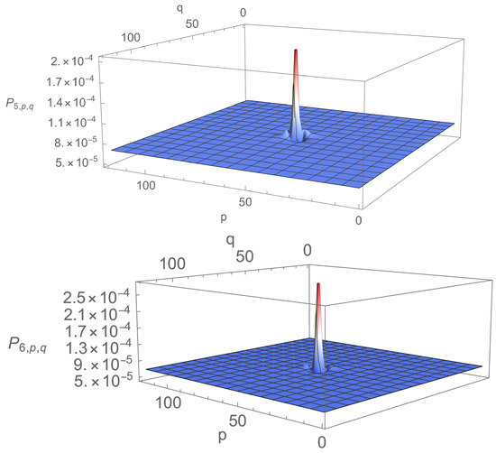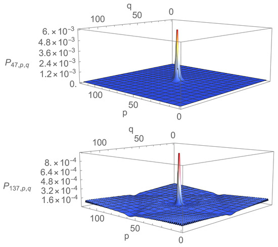 A final comment on the density profiles is in order. The absolute values taken by the density may appear to be rather small. The main reason for that is the total number of points over which the walker moves. A uniform probability spread uniformly over points amounts to . The density profiles corresponding to reveal that the peaks are then approximately above this value. However, the peak for at time corresponding to the first maximum of is approximately , corresponding to an increase of with respect to uniform spreading, which is quite substantial. Whatever the increase, the absolute value of may still be considered small compared to unity. However, it is not vanishingly small. Moreover, as already indicated in the introduction and as discussed in the final section, the search procedure offered by the DTQWs presented cannot be considered complete, since the probability of finding the walker on the four vertices surrounding is never equal to unity. The search should, therefore, be complemented by amplitude amplification.