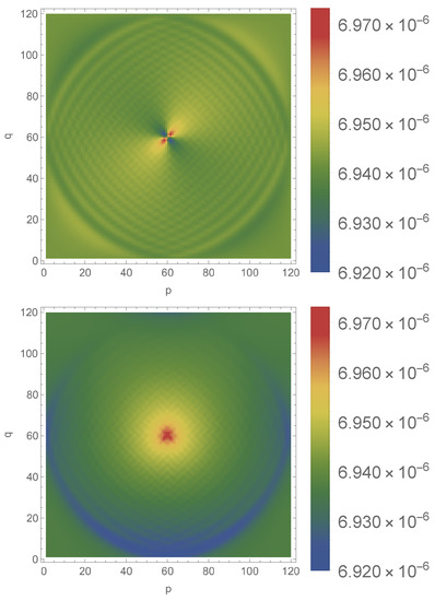 except on the borders of the grid, where we impose the potential to vanish identically, thus preserving periodicity in both p and q. The above expression coincides with the Coulomb potential created by a point charge Q situated at point . To ensure that the walk is defined at all points in the grid, the point where V diverges must not be on the grid. A simple possibility is to choose at the center of a grid-cell equidistant from the four vertices of this cell. The distance in the Euclidean plane between and these 4 points is then , and the maximum value taken by the function V on the grid is the following.
