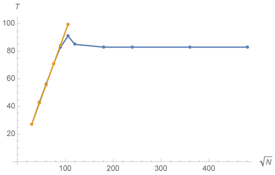Let us now explore how the time T at which reaches its first maximum evolves with N. Typical results are displayed in Figure 7 and Figure 8 for and . Figure 7 displays the time T of the first maximum of as a function of N. At small N, T increases as but T is asymptotically constant. This unexpected behaviour has been observed numerically for all values of a; the greater a is, the sooner the asymptotic regime in which T is independent of N is reached. For example, for , the asymptotic regime is reached around .