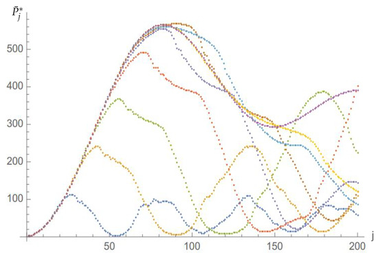 Figure 8 displays the renormalised probability plotted against time for (blue), (orange), (green), (red), (navy blue), (brown), (cyan), (yellow) and (purple). The scaling and the constant asymptotic behaviour can naturally be observed in this figure too. Figure 8 also shows that, quite remarkably, the function is essentially independent of N on the left of the first maximum. Note also that the short N-scaling does not involve .