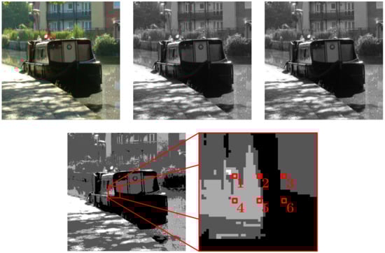 The sampling of a digital photograph using six nodes, , and a four shade gray scale, . This gives . Top-left to bottom-right: the first image is the original, the image is then desaturated and then a contrast enhancement is applied (the contrast enhancement is not needed but may allow the use of a smaller number of samples which is computationally desirable), next the image is posterised (the number of shades is reduced to four giving a four-state node repertoire) and finally the sample is taken. The same sampling method is used for hundreds of images giving hundreds of system states in our sample.