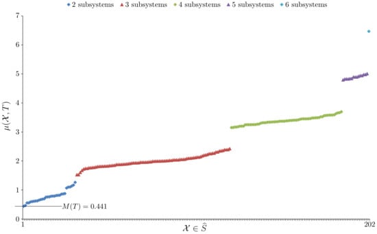 Before moving on to the Results Section it is also worth mentioning that, for the investigations undertaken in this article, significant improvements were made to the efficiency of calculating EFE itself. In particular, before beginning the calculation of float entropy values, the Quicksort algorithm was used to sort the system states according to the value of shown in (1); and similarly so when calculating EFE for subsystems of S. The importance of improving the efficiency of calculating EFE values became clear in undertaking the research for this article because at first a number of potential alternatives to using EFE were tried. In particular, summation ([] (3)) was found not to behave like EFE unless the probability distribution of the system involved was close to being uniform which is usually not the case. A number of other surrogate functions were also tried but none were able to capture EFE and none worked well enough to be used in place of EFE. These efforts reinforce the use of EFE, as given in the Introduction and going back to [,,], as the correct definition to use in this theory with regards to primary models.