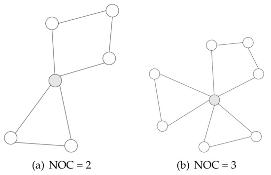 In sociology, a structural hole represents a user who connects with multiple non-interacting parties. The name comes from the notion that an ’empty space’ will be left in the network if such a user is removed. Typically, the Number of Communities (NOC) is used to represent the property of structural holes [16,27]. A node with a high NOC indicates that it is structurally important because it connect diverse regions in the social network. As shown in Figure 1, two gray nodes with NOC = 2 (Figure 1a) and NOC = 3 (Figure 1b). Obviously, computing the NOC of a node involves the detection of communications in a given social network. Previous works [27,28] have shown it is a highly consuming computation process. On the other hand, NOC alone has many limitations to represent the property of structural holes in a large-scale social network, thus it is hardly applicable in real-world applications. We refer readers to [28] for more details about social principles and theories.