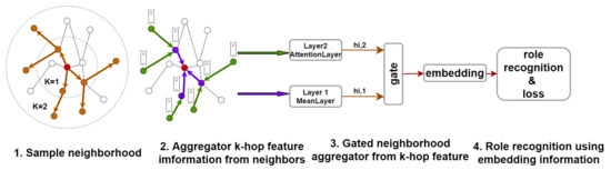 The key idea of this step is to aggregate feature information from a node’s local neighborhood while highlighting the importance of each neighbor. In our solution, the nodes’ embeddings are generated by controlling the aggregation of both direct and multi-level distant neighborhood features using a gating mechanism. The role inference network architecture is illustrated in Figure 3.