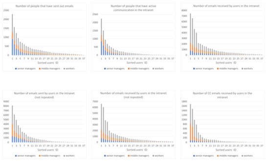We selected six features, as shown in Figure 4. These features are related to the number of emails sent or received, the number of people actively communicating, and the number of CC emails sent or received. We can clearly observe that people of different levels show obvious differences in their features. For example, it is evident that users on the worker level usually receive many emails compared to those on the other levels, while senior managers rarely receive CC emails. This further shows that the features we selected are meaningful when completing role inference tasks. Moreover, previous work [16,28] also analyzed the major social principles and theories that are closely related to user social roles. From their analysis, various patterns were found to be represented in different social properties, and thus can be utilized to classify social roles. Based on this, we combined one of the sociological features ( LCC ) with our structural features to improve the expression ability of the user’s feature.