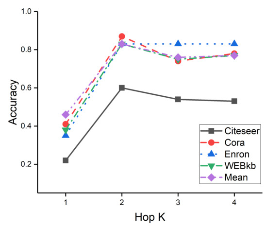In our method, the result of the k-th layer denotes the aggregation information of the k-hop neighbors. Figure 5 shows the accuracy of our method with 1–4 layers on the baseline dataset. Our method with two layers achieves the best performance across all the datasets. We observe that the proposed method’s performance declines with the increasing of layers. Although deeper layers allow us to capture distant neighborhood information by layer-to-layer propagation, the use of such distant neighbors would introduce a large amount of noise. Therefore, aggregating two-hop neighborhood information is sufficient for node embedding.