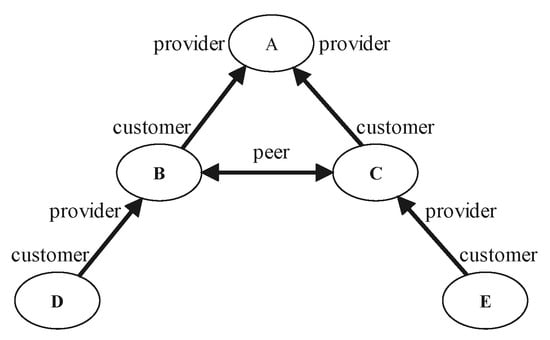 With the continuous development of the Internet, the number of users on the network has grown extremely fast, and the scale of the inter-domain routing systems has continued to increase. An inter-domain routing system is a dynamic system composed of multiple autonomous systems (AS). It usually has four kinds of business relationships: customer-to-provider, provider-to-customer, peer-to-peer, and sibling-to-sibling []. AS generally refers to a collection of routers that belong to a management organization, and they can make their routing strategy. The routing information is exchanged between AS through the inter-domain routing protocol. Here it refers to the border gateway protocol (BGP). As the Internet’s only inter-domain routing protocol, BGP is the postal service of the Internet. AS plays the role of a branch of the post office. When users’ data requests were sent across the Internet, all of the data transmissions’ available paths were charged by BGP. It chooses the best route, making a hop between autonomous systems.