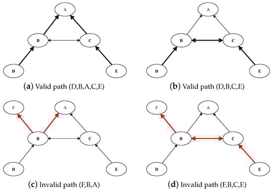 The business relationships is shown in the Figure 1, with the arrow of the line in the direction of payment. For example, means that customer B pays provider A, and B is a customer of A, that is, a C2P. A is the provider of B, that is, the P2C. At this time, customer B can exchange information with A to obtain resources. Similarly, customer D has to pay B to access resources. For , it is a peer relationship, that is, a P2P. The relationship between the two ends of the connection is equal, and information can usually be exchanged for free. Therefore, to exchange information between nodes of an inter-domain routing systems, links and business relationships are required. Otherwise, the path may be invalid. The following examples illustrate valid and invalid paths.