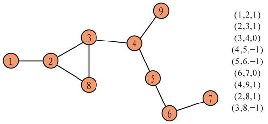 In order to illustrate the effectiveness of the DBR algorithm, it was compared with the commonly used shortest path discovery algorithm [] (Dijkstra) in a simple network. Figure 3 shows a simple network with business relationships. On the right is the business relationships between nodes, which is illustrated by (A,B,X). A and B are nodes, and X is the business relationships between A and B. If X = 1, then A and B are in a C2P relationship; if X = 0, then A and B are in a P2P relationship; and if X = −1, then A and B are in a P2C relationship. A total of 36 routing paths were found through the Dijkstra algorithm, and a total of 25 routing paths were found through the DBR algorithm. The extra 11 paths were confirmed to be invalid after a check. All the 11 extra paths were invalid. For example, there was no routing path for the node pair (1,7) and (1,9), and the path calculated by the Dijkstra algorithm was an invalid path. Therefore, it can be explained that the DBR algorithm can correctly identify the routing path in inter-domain routing systems.