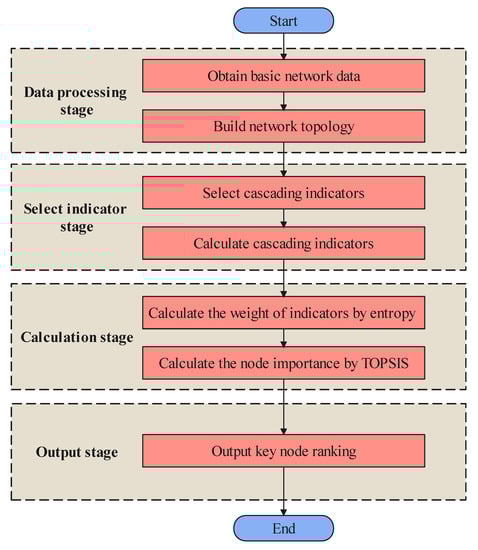 As shown in Figure 4, IKN-CF mainly consists of four steps. The first step is to obtain basic network data, including business relationships and connection relationships. Then, the network topology is constructed to facilitate the calculation of the indicator. The second step is to select the cascading indicator that reflects the importance of the node, which is used to approximate the impact on the network after the node fails. The third step is to construct a key node identification model, including calculating the weight of the index and applying the TOPSIS method to obtain the importance value of the node. Finally, the ranking of importance of nodes is obtained. The important steps are described in detail below.