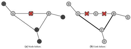 Figure 5 is used to illustrate the effect of node and link failure. The heavier colors of nodes or links in the figure are caused by increased loads. In Figure 5a, after node G fails, neighbor nodes A and B will generate UPDATE messages, and reachable nodes C, D, E, and F of node G will receive UPDATE messages to increase the load. Afterwards, it is judged whether the number of UPDATE messages arriving at the same time is overloaded, and the overload becomes invalid. In Figure 5b, after node G fails, link AG and BG through node G are disconnected, and the traffic load that originally passed through node G will be rerouted to link AC and BC. In this case, the load of link AC and BC increases. The overload state also becomes invalid. Therefore, how to select reference indicators to approximate the impact of these two aspects on the network is the primary problem to be solved in evaluating the importance of nodes.