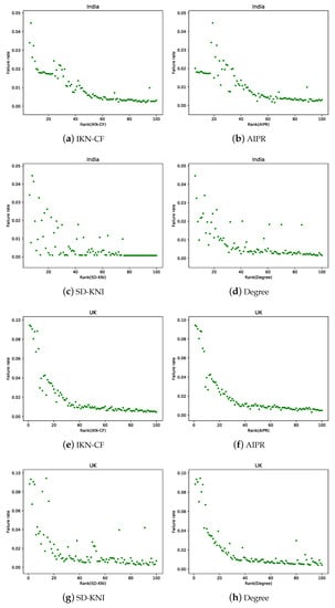 As shown in Figure 6, in the Indian network, the importance ranking result of IKN-CF proposed in this study had the best effect compared with other methods, and the FR basically decreased with the increase in the importance ranking number. The AIPR resulted in a ranking with the first 20 nodes, which is obviously not reasonable. SD-KNI had the worst ranking result for the importance of nodes, and the importance of nodes after ranking number 76 was consistent, indicating that the was is not accurate and that the method is relatively rough. As shown in Figure 6d, the overall trend of degree ranking results was better than AIPR and SD-KNI, but the ranking results were somewhat scattered. In the UK network, the results of the AIPR and IKN-CF were reasonable. As shown in Figure 6g, the SD-KNI ranking result was the most chaotic. According to the ranking obtained by the degree, there were more nodes with high importance in the ranking numbers between 80 and 100, as shown in Figure 6h. We found failure rate faults with the decrease in the importance of nodes, indicating that the nodes with extensive damage to the network were more concentrated.