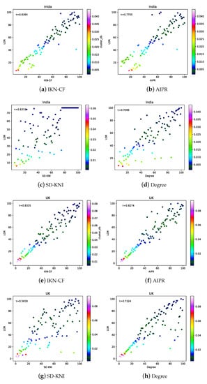 In the UK network, the between IKN-CF and LOR, which was still the best among the four methods. The between AIPR and LOR, and it as similar to IKN-CF. This shows that the two methods were equally accurate in the UK. As shown in Figure 7h, by observing the position and color of the dots, the ranking result of degree was the most accurate at the nodes with a ranking number between 10 and 20.