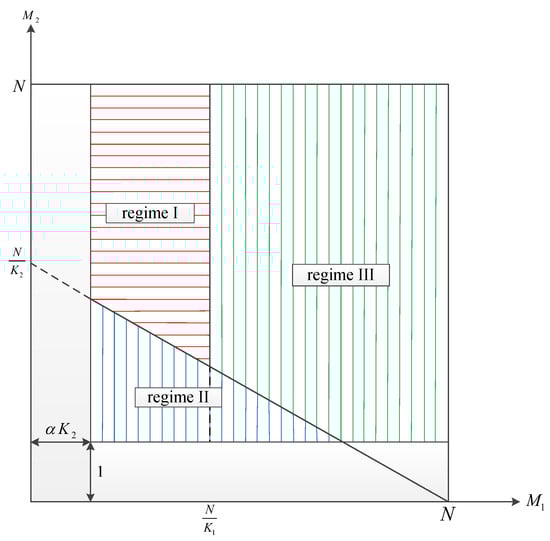 While analyzing the rates in each scheme, we separately consider each of the three regimes proposed in []. This makes it plausible to compare our results to those obtained in []. The mentioned regimes are characterized as shown in Equation (3) in terms of and ,
